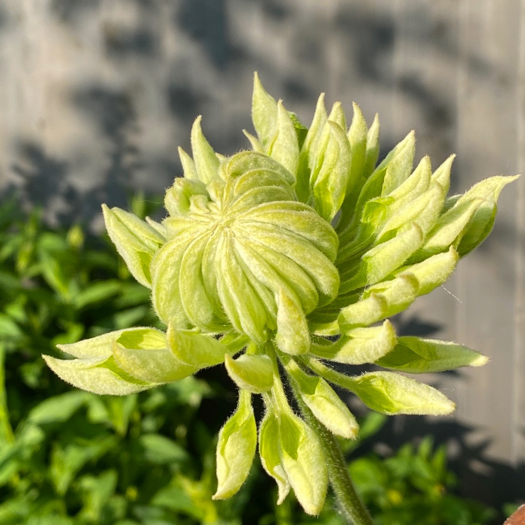 Clematis Green Passion (early opening stage before it puffs up like an imperial chrysanthemum) – Jan Mundy